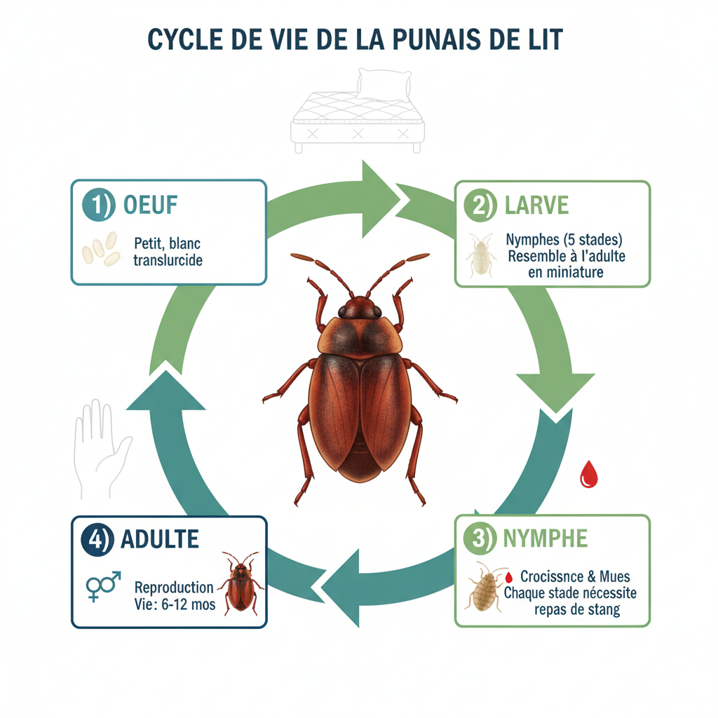La punaise de lit passe par cinq stades nymphaux avant d'atteindre l'âge adulte, chaque stade nécessitant un repas de sang. Une femelle adulte peut pondre jusqu'à 500 œufs au cours de sa vie, assurant une prolifération rapide si l'infestation n'est pas traitée.